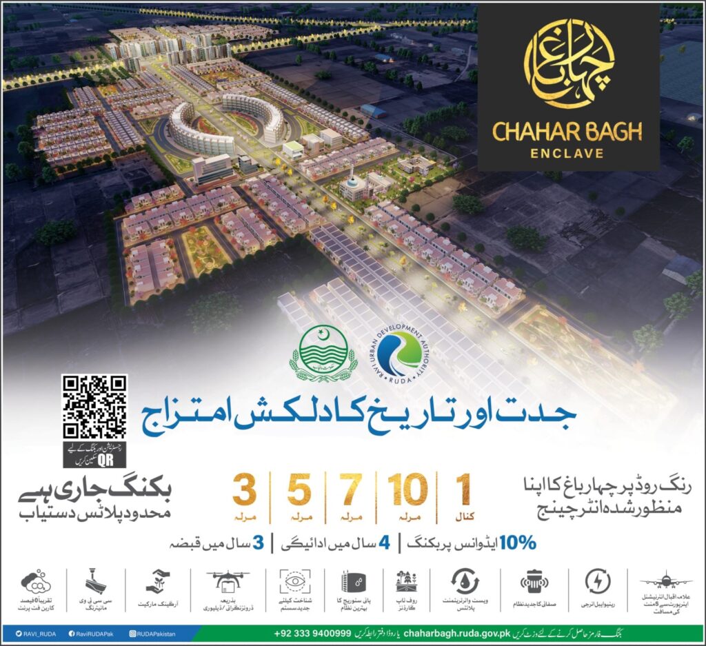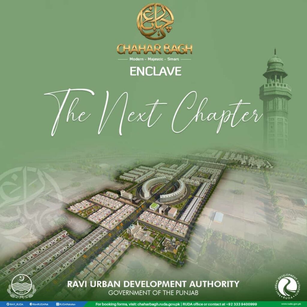 Ravi Urban Development Authority (RUDA), the pioneer of Chahar Bagh, unveils its latest masterpiece – Chahar Bagh Enclave. This meticulously planned enclave, sprawling across an expansive 185 acres, will seamlessly connect to its thriving predecessor, Chahar Bagh, via a majestic 220-foot-wide road. Within its embrace lies a harmonious blend of over 1700 thoughtfully curated plots, catering to a diverse range of residential aspirations, from the compact comforts of 3 Marla plots to the spacious grandeur of 1 Kanal plots.